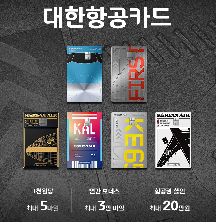 또는 제휴사인 현대카드와 콜라보한 "대한항공 현대카드"를 발급하여 여행 전에 꾸준히 사용하여 마일리지를 쌓아나가는 방법도 좋은 거 같아요! 대한항공 현대카드는 1천원마다 최대 5마일리지를 쌓을 수 있으며 한도는 무제한입니다!